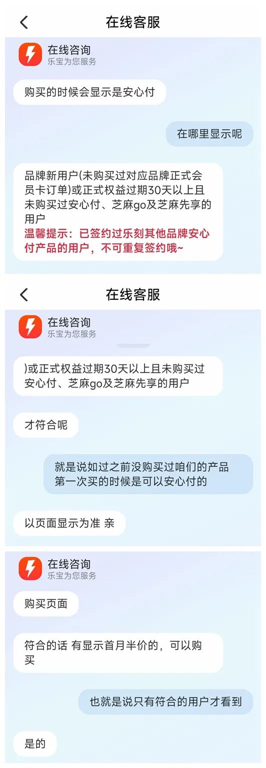 针对“安心付”退费规则是否明确告知的问题,记者询问了乐刻客服,对方表示,只有品牌新用户等符合相关条件的人才能开通,以页面显示为准。